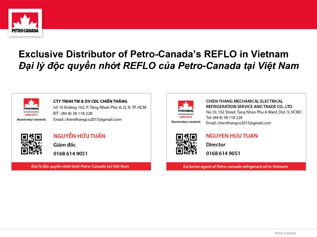 CÔNG TY TNHH TM & DV CƠ ĐIỆN LẠNH CHIẾN THẮNG           Đại lý độc quyền nhớt lạnh Petro-Canada tại Việt Nam           Địa chỉ: Số 10 Đường 102 Phường Tăng Nhơn Phú A Tp.Thủ Đức TPHCM         Tel: 083 6149 051 - 02838 118 228          Email : chienthangco2015@gmail.com